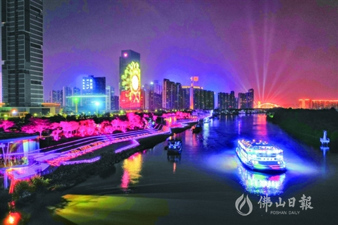 三龙湾游船行经流光溢彩的东平水道龙舟广场段。/佛山日报记者张弘弢摄