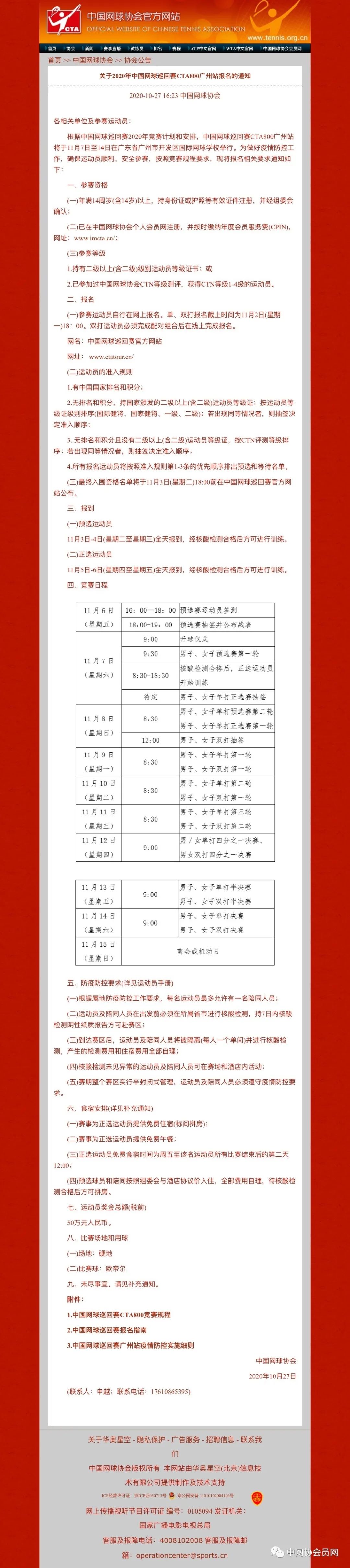 根据中国网球巡回赛2020年竞赛计划和安排,中国网球巡回赛CTA800广州站将于11月7日至14日在广东省广州市开发区国际网球学校举行。单、双打报名截止时间为11月2日(星期一)18:00。