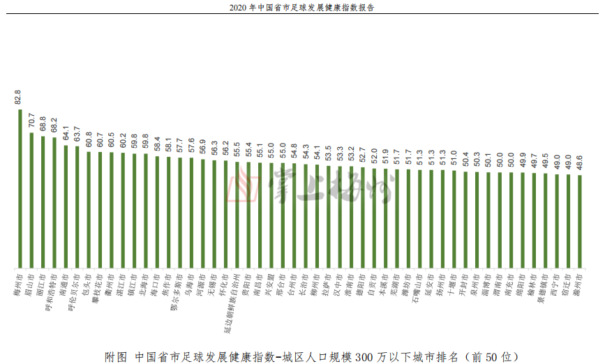 报告根据人口规模对1000万以上城市、300万-1000万,300万以下城市进行了评分排名。报告指出,2020年中国省市足球发展健康指数全国总得分为40.6分,总体处于较低水平。