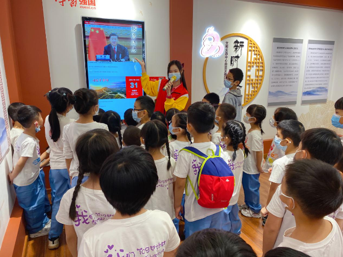 作为新会首批乡村“复兴少年宫”之一,新会区新时代文明实践中心积极强化“造血”功能,于课余时间、节假日期间积极统筹、组织、打造“小红星”宣讲队、“文明导赏员”志愿讲解队等未成年人志愿宣讲队伍。6位音乐党课“小助教”——“文明导赏员”为这群萌娃开展红色讲解服务,以《不忘来时路》影片播放、文明实践图片展示、新科技机器互动等“情景式”学习教育方式,引导萌娃们传承红色基因。