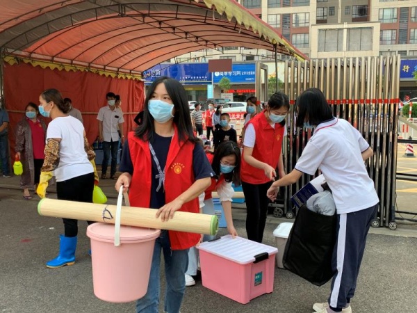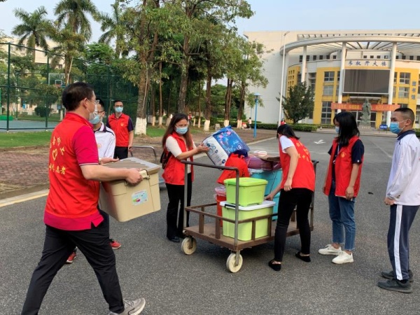 在经历了一个漫长而又特殊的假期之后,4月27日,东凤中学初三学生按照学校安排首批返校复学。为落实校园疫情防控工作要求,家长及陪同人员不能陪同住宿生进入校园,因此继疫情期间“停课不停教”、“教师变‘主播’”之后,学校党员教师再次转变角色,主动亮身份做表率,代替家长们帮助有需要的学生一起搬运生活用品到宿舍,穿梭在校园里的红色身影成了复学首日最闪亮的一道风景。