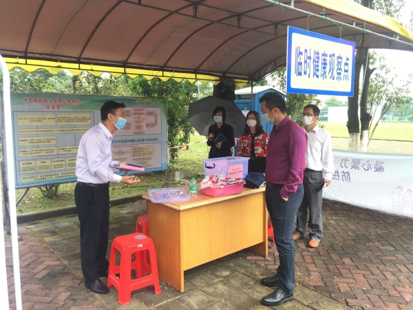 为确保师生生命安全和身体健康,4月22日下午,中山市2020年春季学期学生返校疫情防控验收组莅临东凤中学进行验收。以市教体局副局长黄学礼为组长的验收组莅临东凤中学,验收学生返校准备工作,市卫健局李雷,市市场监管局陈政波,市教体局严庆中等专家参与验收工作,东凤镇党委委员刘燕文、文体教育局局长黄春光、镇教育事务指导中心主任熊小潮陪同。