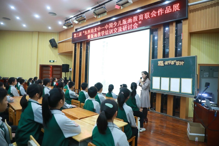 26日,在该校朗言厅内,珠海容闳学校常务副校长、教育部“国培计划”美术学科专家常晓冰作题为《通过艺术的教育—唤醒·生命系列艺术课程分析》的主题报告,广东省特级教师、岭南少年儿童版画教育研究会会长王鹏发表题为《岭南少儿版画之“东西南北中”》的讲话,东区街道教育和体育事务中心赵海宾以《东区美术特色学校建设》为题,介绍了东区版画特色项目。