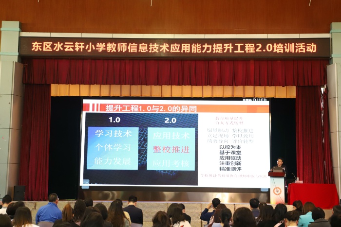 2月19日上午,东区水云轩小学全体教师齐聚风雨球场,以蓬勃的朝气去迎接新的一年。活动开始,陈明宏老师、林小舟校长一齐按下启动键,水云轩小学教师信息技术应用能力提升工程2.0正式启动。随后,陈明宏老师为老师们作题为《中小学教师信息技术应用能力提升工程2.0的理解与实施》的专题讲座。讲座中,陈老师从信息技术2.0的时代背景、内涵理解、中山方案、校本实施四个方面进行讲授,以列举关键词和思考探究的模式与在场教师交流研讨,明确信息技术2.0“三提升一全面”的总体发展目标,并根据校情对轩小“整校推进”实施方案进行耐心、细致的解析和指导,为学校构建以校为本、基于课堂、应用驱动、注重创新、精准测评的教师信息素养发展新机制指明方向。通过陈老师的讲解,教师们对信息技术2.0有了更深入的理解,纷纷表示信息技术融合教育是时代所趋,更是教师们为实现有效教学理应具备的一项技能,日后将循序渐进地将信息技术运用到具体教育教学工作中去,提升自身教育信息化应用能力。同时,陈老师也对水云轩小学寄予厚望,希望轩小教师在信息技术应用提升方面能达到真研修、见真章、显真功、出真效,成为信息技术应用的高手!