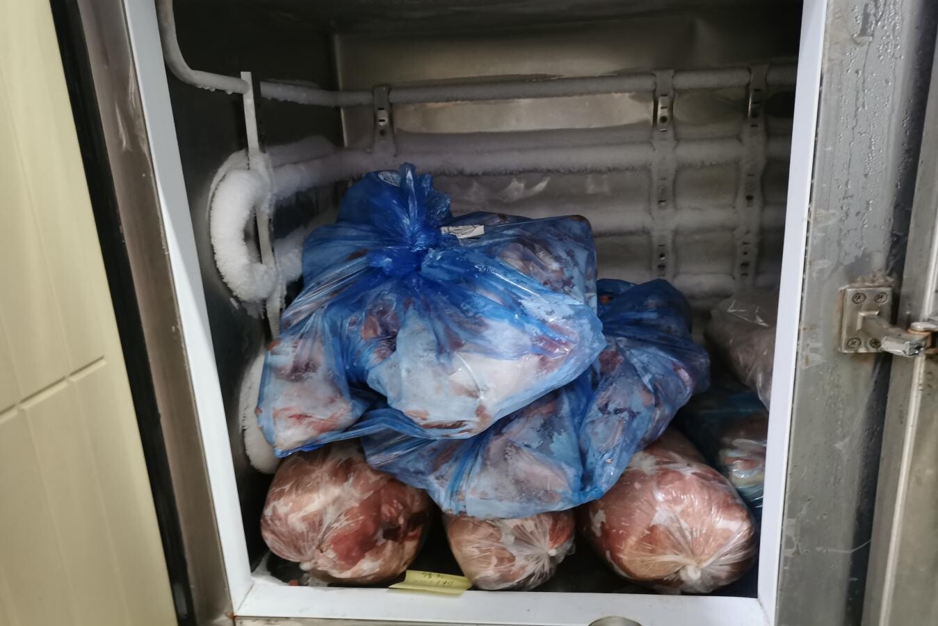 在冰柜里发现使用有色塑料袋贮存食品,可能污染食品