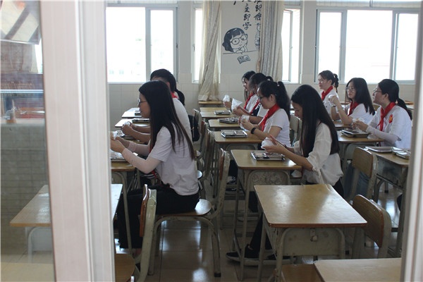 第四个场景是学生午餐就餐演练。模拟顺序为“七步洗手法—课室就座—间隔领餐—正确摘放口罩—就餐—戴回口罩”,期间保持一米间隔距离及避免交谈,如果出现打喷嚏或者咳嗽,用手肘遮面或纸巾捂住口鼻以防感染。
