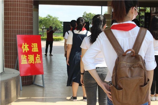 最后是学生放学离校带队及等候演练。模拟下午分批放学时,由各班主任组织学生按照一米间距在走廊集合,分排两路纵队走到校门口,家长们有序接孩子放学。家长暂时未到的学生由班主任带回教室等候,家长到校后联系班主任并在家长缓冲区等候孩子出来。