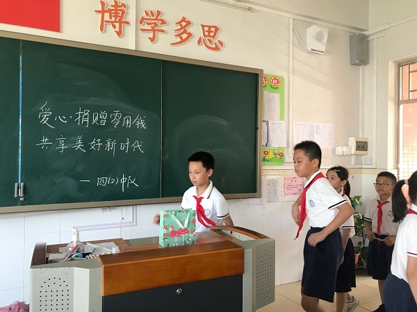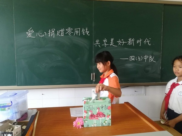 捐款活动以中队为单位,在各自的教室进行。每个班的黑板上都写着醒目的“爱心捐赠零用钱,共享美好新时代”几个大字。队员们在中队辅导员的带领下井然有序排好队面带微笑地走上讲台,手中高举着自己的零花钱,郑重其事地投向捐款箱,一元、五元、十元…… 爱心在一间间教室传递,不一会,捐款活动圆满结束!