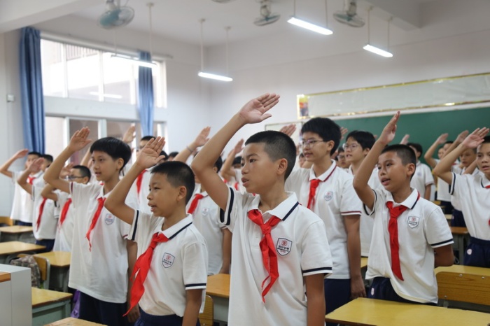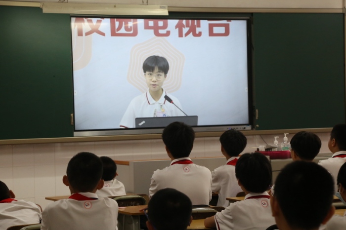 下午突降大雨,按照预案,全体师生留在教室。学校利用校园电视台,举行了简洁明快的开学礼。开学礼必不可少的仪式——展国旗高唱国歌顺利进行。在雄壮的国歌声伴奏下,师生们注目大屏幕上的国旗,一起唱响了国歌。通过电视屏幕,同学们一一认识了学校行政团队成员。