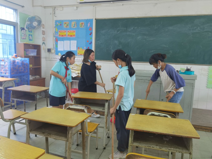 烈日炎炎,却也挡不住每个班级的家长志愿者积极参与的热情。家长和孩子们在班主任老师的带领下来到新班级,二话不说,撸起袖子直接干活。孩子们拿着水桶接了水,开始把课室的桌椅擦干净,还主动擦门框窗框等。家长和老师们也没有闲着,个子高的家长取下窗帘,清除天花板的卫生死角,大家相互配合,分工合作。孩子们做完力所能及的班务后,又主动帮助大人们干活。在这种热火朝天的气氛中,原本落满尘灰的课室此时已焕然一新,墙壁、地面重新恢复了光洁明亮;窗帘也散发着清新的香气;杂乱无章的课桌椅摆放得整整齐齐。看着窗明几净的教室,大家脸上不约而同地露出了笑容。