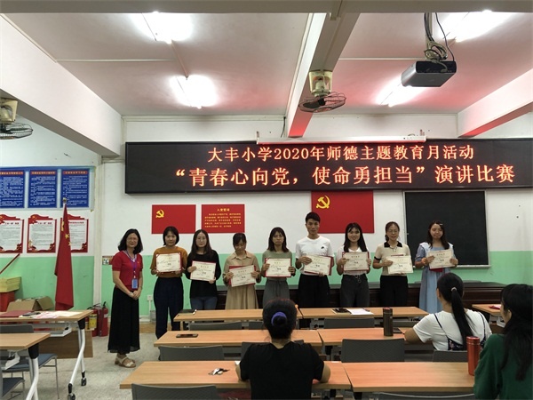 为了进一步加强师德师风建设,全面提升教师思想政治素质和职业道德水平,努力造就一支师德高尚、业务精湛、充满活力的高素质教师队伍,10月12日下午,大丰小学结合“不忘初心,牢记使命”师德建设主题教育月活动举行了一次“青春心向党,使命勇担当”的演讲比赛。