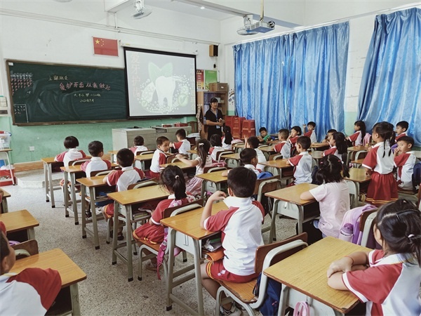 当天的升旗仪式上,学校大队委曾凡苑老师进行了主题为“爱牙护牙,从小做起”的国旗下讲话,曾老师提醒同学们在享受快乐生活的同时,别忘了关注自己的口腔健康,号召同学们要积极行动起来,努力做到从小爱牙护牙,拥有一副健康洁白的牙齿。下午,学校组织了低年级的班级开展了一次“爱牙护牙”主题班会课,班会课上,根据一年级学生正处于换牙阶段,班主任们向同学们介绍了换牙期间的注意事项,并通过故事、小游戏、图片和视频等形式向同学们讲述了牙齿的构成及其作用。以“全国爱牙日”为契机,针对龋齿带来的危害,班主任们还介绍了保护牙齿的方法,有效地宣传了如何预防龋齿、减少口腔疾病,让孩子们更好地保护自己的牙齿。此外,学校还利用张贴宣传展示栏图片的形式引导学生早晚正确刷牙,帮助孩子们养成良好的生活卫生习惯。