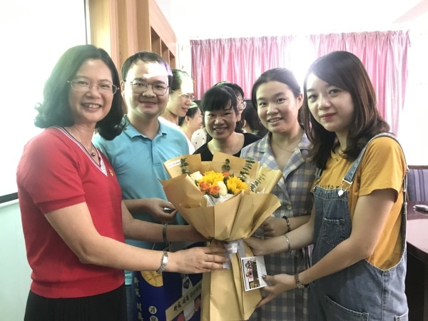 活动在青年教师代表施惠群老师、周艳珍老师和林文佳老师的成长感言中拉开序幕。周老师谈到大丰小学是她的幼儿园,而苏少丽校长就是她的启蒙老师,在日常的教学中,周老师感受到了苏校长对她的指导与帮助。 “点滴之恩当涌泉相报”,青年教师对导师们饱含深情的感恩之言把活动推向高潮,各位青年教师以自己喜欢的方式向导师表达感激之情,有热情的拥抱,有鲜艳的花束,也有写满温情话语的明信片。