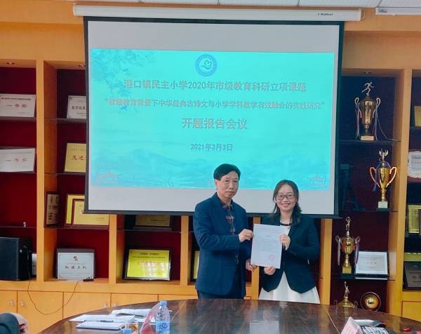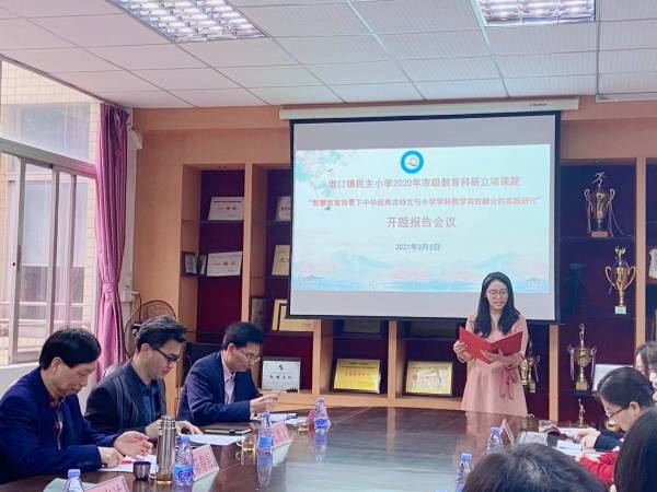 “东风好作阳和使,逢草逢花报发生。”3月3日上午,迎着和煦的东风,带着对教育的热忱和思考,民主小学迎来了2020年市级立项教育科研课题“智慧教育背景下中华经典古诗文与小学学科教学有效融合的实践研究”开题报告会。参会的领导、专家有中山市教育学会陈春艳会长、中山市教研室林晓洁老师、港口镇教育和体育事务中心张育文副主任、苏彩南老师,以及民主小学林宗技校长、课题组全体成员。会议在学校的荣誉室举行,由周天乐老师主持。