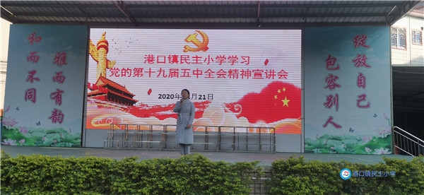 为深入学习贯彻十九届五中全会精神,12月21日下午,民主小学党支部邀请了十九届五中全会宣讲团到校宣讲。本次活动由十九届五中全会精神中山市宣讲团讲师、港口镇中心小学林国瑜主任主讲,港口镇教育党委副书记、教体文旅局副局长刘长路,港口镇教育党委成员代表民主小学党支部书记李小健, 民主小学四五六年级全体少先队员及全体支部党员参加了此次活动。