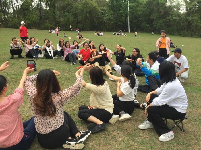 和风微拂,紫马岭公园的草坪上传来欢声笑语,循声而望,正在进行的是一场别出心裁的教师团建活动。全体老师抽签分为六个小组,每组成员为自己设计组名、口号。而后在这片绿意盎然的草地上,各小组围成一个大圈,纷纷铺开桌垫,放上自己精心准备的美食,准备尽情地享受着。