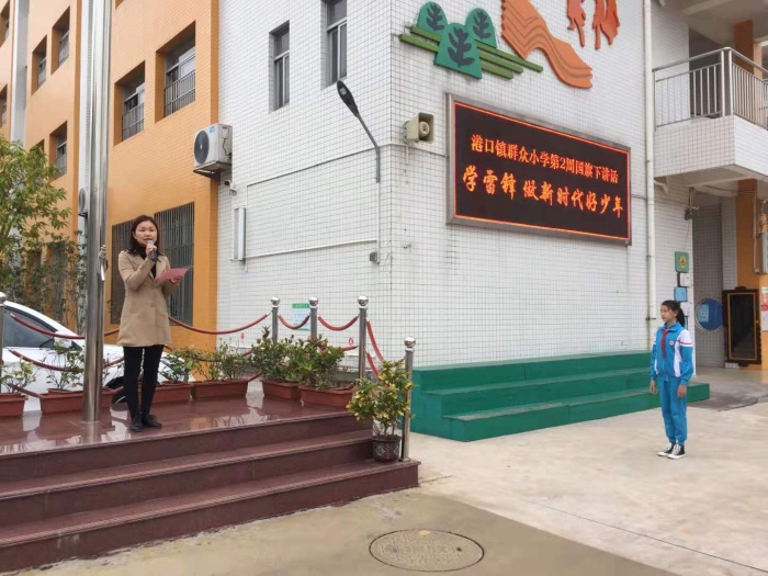 3月1日升旗礼上,群众小学开展以“学雷锋,做新时代好少年”为主题的雷锋月系列活动启动仪式。在国旗下,六(2)班的少先队员代表徐海航同学代表讲话,他向大家提出倡议:学习雷锋刻苦学习、公而忘私、助人为乐的精神;大队辅导员胡婵媛老师呼吁全体少先队员要像雷锋叔叔那样做好每一件小事,做雷锋式的好少年。