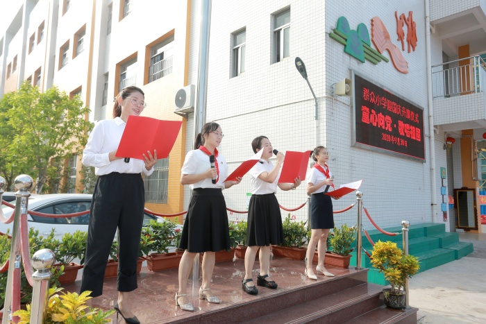 当清晨的阳光洒入群众小学,主持人宣布升旗仪式正式开始。在全体师生的注视下,由教师组成的国旗护卫队身着整齐的军装,迈着整齐划一的步伐,护卫着鲜艳的五星红旗,迎着朝阳缓缓走向升旗台。当雄壮的国歌响起,鲜红的五星红旗像一团炽热的火焰,沐浴晨曦,在阳光校园迎风飘扬。全体师生庄严肃立,高唱国歌,全体少先队员面向国旗庄严行队礼,激动地、虔诚地注视着国旗冉冉升起,一股强烈的爱国热情在每个人心中升腾。