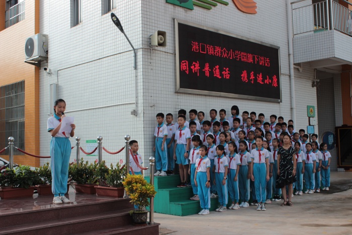 港口群众小学推普周启动仪式在本月下旬正式拉开帷幕。周一升旗礼上,伴随着徐徐升起的国旗,五(3)班的学生代表在国旗下进行了演讲,他介绍了推广普通话和使用规范字的意义,对全体师生发出了“推广普通话,使用规范字”的倡议。