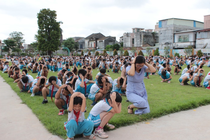 “呜——呜——”随着防空警报响起,全体学生在老师的指挥下,迅速进入应急状态,有序紧急疏散学生。所有学生按照防火逃生演练路线,迅速而有序地通过各楼层疏散撤离到学校操场上。