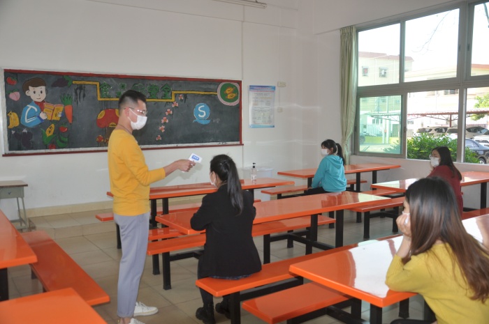 下午2:00演练正式开始,参加演练的人员各就各位,第一部分内容为返校晨检演练:各年级各班级学生错时错峰在校门外依序排队,保持一米以上距离——监测体温(晨检)——体温正常入校,如有体温异常要进行登记,水银温度计复查体温后正常方可入校,复查后异常,通知家长,学生佩戴医用口罩由家长或送医院发热门诊就诊,并做好后续追踪。