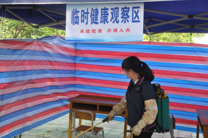 第二部分内容为上课应急处置演练:某日上午第二节课,六(2)班班主任发现吴同学精神萎靡,并伴有咳嗽发烧等疑似症状,随即对该生进行体温测量后,将体温异常学生带到留观室,立即将情况上报梁倚静主任,梁倚静主任上报给黄权炎校长,梁倚静主任将情况上报镇疾控中心罗升主任(郭有胜扮演)。经疾控中心核查其为可疑病例。黄权炎校长将情况上报港口镇教育事物指导中心陈树洪专干(王广东老师扮演),并立即召开应急处置领导小组会议,宣布启动学校的疫情应急处置预案。可疑病例在留观室等候120急救车将其送到定点医院诊断及隔离治疗。学校配合有关部门做好医学隔离,加强与管理人员、师生亲属的沟通;加强对未成年人的监护,随时掌握学生健康情况。