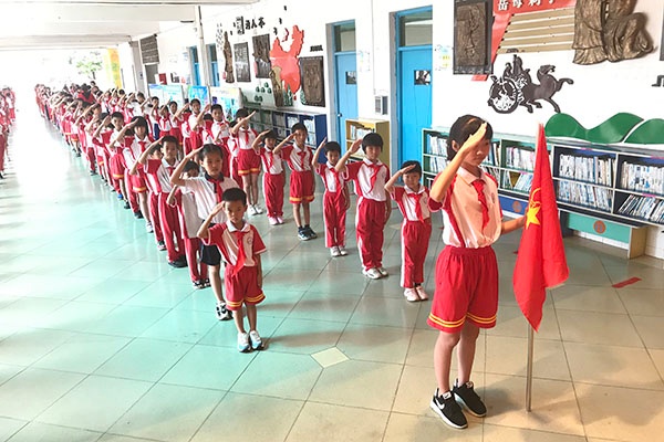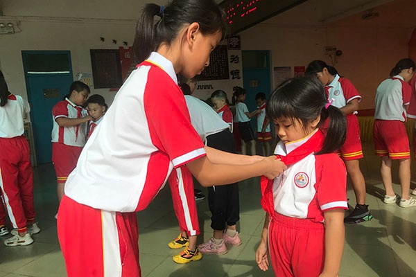 6月8日下午三点,随着一声“全体立正,出旗!敬礼!”的指令,少先队队旗手精神抖擞地迈着庄严而有节奏的步伐走来。在火红的队旗下,在星星火炬的指引中,全体少先队员高唱《中国少年先锋队队歌》。嘹亮的歌声,唱出了每位同学心中的自豪与骄傲。大队辅导员黄施雅老师宣读了新队员名单。瞧,同学们满脸的笑容,激动的内心,老队员为系好红领巾的那一刻,是多么的神圣和富有使命感!接下来,黄老师带领所有的队员在队旗下庄严宣誓,准备着为共产主义事业贡献力量!