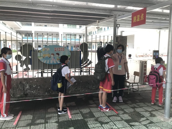因学校采取了分批错时入校的措施,学生有序进入校园,通过双手消毒、体温测量等一系列步骤下来,均能有条不紊。班主任在教室门口对学生进行第二次的体温测量并登记之后,便和学生一起拉开了新学期开学典礼的帷幕。