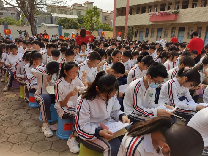 之后,一封来自父母精心准备的信递到每个初三学生的手中,看着父母的书信,学生们流下了感动的热泪,父母以最真挚无私的语言触动了学生们的心。港口镇党委委员罗希京也对初三学子提出希望:希望初三学生以考入名校的学长学姐为榜样,学习“苦心人,天不负,卧薪尝胆,三千越甲可吞吴”的精神,奋战百天,蟾宫折桂。最后,全体初三学子庄严宣誓,并在奋战百日奋战书上签名。