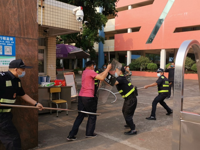 3月16日,为了提升校园安全管理工作水平和安保应急处置能力,确保师生安全。学校组织开展校园安保人员培训暨安保演练活动,学校副校长张丽君对安保人员提出希望,希望安保人员努力提升业务能力,工作中做到细心敏锐,处理突发事件镇定敢为。此次演练模拟学生放学时段受外来人员暴力袭击的情境。演练模拟放学时段,陌生男子提出无理要求进入校园,并准备袭击学生,安保人员立即拿起盾牌钢叉等进行防护,保护学生并制服暴力分子。同时学校保安进行报警并和校领导汇报,等待下一步处理。演练过程有序规范,保安临危不乱,应对得力有效。