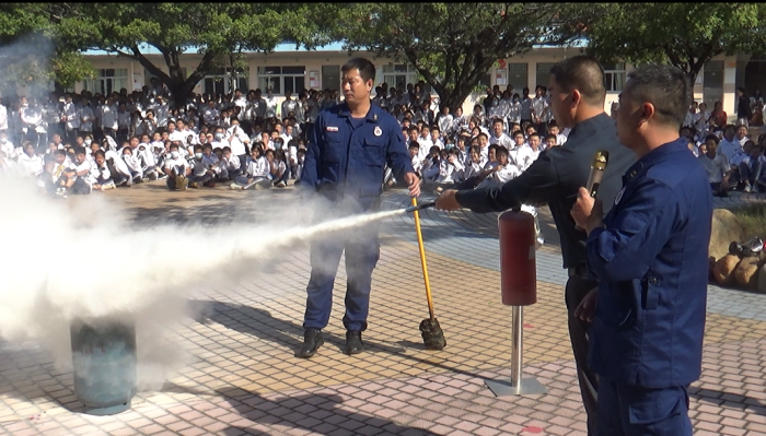 随后刘启堂指导员手把手地指导教职员工、学生进行灭火实操演练。管德丰校长、赖其森主任、教师、厨师、保安、教官和学生代表,纷纷拿起灭火器,对着熊熊烈火喷射干粉,火立即被扑灭,然后迅速拧紧煤气罐。广大教职员工、学生实操演练热情高涨,在实操中,感受到火势的凶猛和灭火器的威力,灭火的正确姿势,从而提高了火灾处理应变能力。