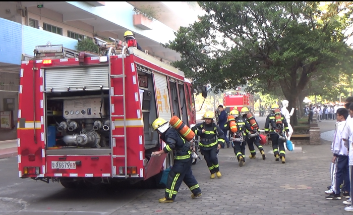 上午9时15分,烟幕弹突然爆炸,烟雾弥漫整个校园,紧急刺耳的警报声立即响起,全体师生和教职员工迅速按照设定的逃生路线撤离课室。学生们个个严肃紧张,向紧急疏散场所——中心广场集结。各楼梯口负责引导的老师,按照消防演练方案疏散学生,保证楼内每个学生迅速有序“逃生”,以免在慌乱中出现踩踏以及滞留课室的情况。紧接着两台消防车呼啸而来,快速到达“火灾”现场。消防人员快速穿好装备,带上救援设备,冒着滚滚白烟,冲进“火场”进行紧急施救。班主任快速清点并上报各班人数。整个疏散演练过程从报警到撤离到安全地带,按规定时间完成了疏散演练。