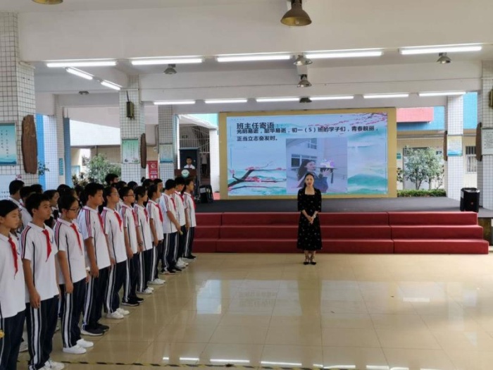 有的班级热爱古诗词,展示出了他们的诗歌底蕴;有的班级擅长传统民乐器,葫芦丝现场伴奏,乐音袅袅;有的班级充满书香文化气息,同学们站得笔直,气质出众;有的班级渴望如雄鹰高飞,表现出他们力争上游的决心;孩子朝气蓬勃,充满活力。稚嫩的初一新生,身上有一股不服输的劲:集体宣誓时声音一班比一班高;比拼才艺,哪个班都不甘示弱,新生们人小胆子大,个人独唱、民族舞个人秀、街舞表演等才艺表演随手拈来;各个班级着装整齐,系着鲜艳的红领巾大声说出对自己的期望、对老师的感谢、对父母的感恩、对祖国的热爱……