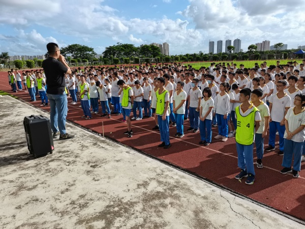 清点完人数后,学校体育科组长谢仕浩老师做了体育中考考前培训和动员。谢老师从考前热身、考中注意事项,考后核对成绩及签名等方面对学生进行了详细地培训。为了实现平安中考,初三年级陈荣欣级长特别强调了考试各项安全注意事项,要求每位学生认真评估自己身体是否可以参加考试,考试过程中如突发感觉不适要及时应对,向老师示意并果断停止考试,采取应急措施。最后,陈级长代表年级给所有学生加油鼓劲,同学们深受鼓舞,信心十足。