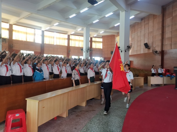 为庆祝中国少年先锋队建队71周年,深入学习贯彻习近平总书记关于少年儿童和少先队工作的重要论述,激励全体少先队员牢记初心使命,始终听党的话、跟党走,夯实中学团队一体化建设工作。2020年10月12日上午,港口镇大南中学在学校阶梯室举行主题为“我是光荣的少先队员”的初一级少先队建队仪式。仪式由叶怡菲老师主持,学校副校长、少工委副主任廖建红,德育处副主任吴权明以及初一级全体师生参加了建队仪式。