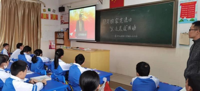 12月4日,“国家宪法日”,全校师生利用晨读时间,通过网络直播,观看教育部在北京全国青少年学生法治教育实践示范基地举办的“宪法晨读”活动。同学们同步跟读“宪法晨读”的文本内容,了解宪法的序言、总纲、人民的基本权利和义务、国家机构、国家标志等知识。同时,全体师生还一起唱响了宪法歌曲——《宪法伴星空体育成长》。