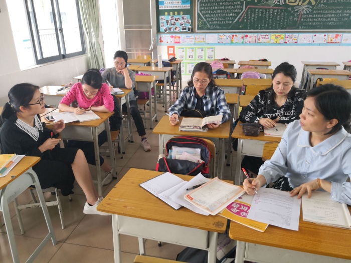 四年级开展的是第三单元集体备课活动。老师们先对上星期集体备课后的教学效果进行反馈,每个成员针对教学中遇到的问题进行发言,并一起深入探讨、找寻解决的方法。接着,曾嘉裕老师对本次备课的教材进行分析,提出本单元的教学目标、教学重难点和教学建议。在现代诗教学中,老师们要逐步培养学生学习收集、整理资料的方法,同时还要培养学生对诗歌的兴趣。每位老师积极参与,各抒己见,讨论热烈。