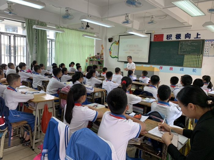 把舵扬帆,由镇南小学总务处主任高清海老师执教的《三角形的认识》,设计层次清晰、环节紧凑,朴实自然,紧贴生活。在认识三角形的教学中最大限度地利用小学生好奇、好动、好问等心理特点,并紧密结合数学学科的自身特点,创设使学生感到真实、新奇、有趣的学习情境,激起学生学习兴趣。在三角形的定义教学中,体验出数学既准确,又简洁。高主任不但关注概念的生成,也灵活利用迁移的方法让学生通过探究,内化为自身知识。另一方面,在课堂上高主任的一声声亲切真诚的“孩子们”,叫得每个学生心里热乎乎的。他的幽默和极具亲和力的教学行为,让“教与学”都不再沉重,尊重、沟通、宽容、欣赏使他的课堂教学充满时代的气息,洋溢着浓浓的师生情。