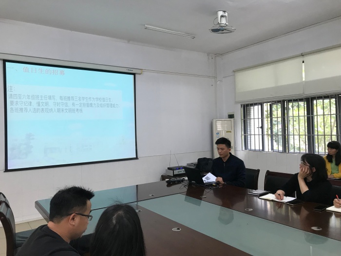 首先,卓主任就开学以来学生值日干部队伍建设、楼层值日情况、卫生清洁问题、红领巾亲子义工的开展情况和学雷锋集市活动进行了详细的反馈。卓主任针对以上活动的问题提出了建设性的意见,他希望全体班主任可以转变观念,把握关键,把常规工作抓实、抓细和抓活。