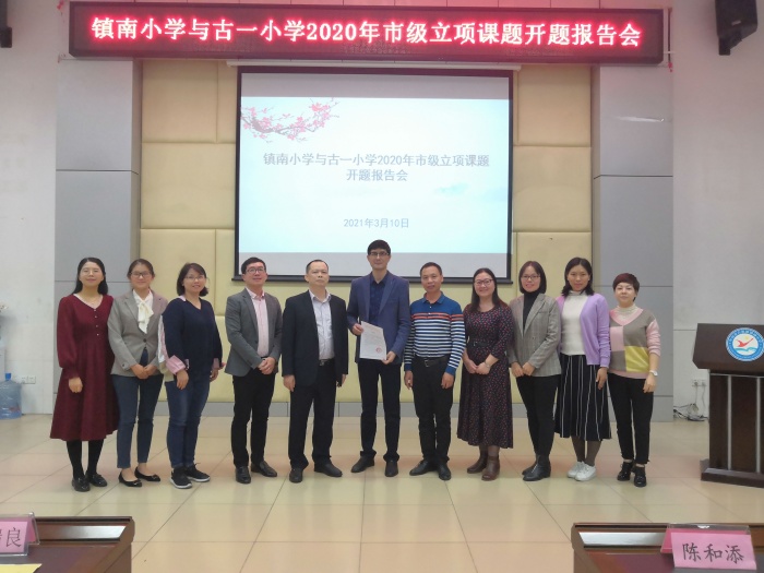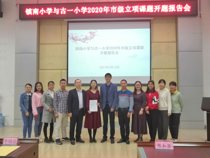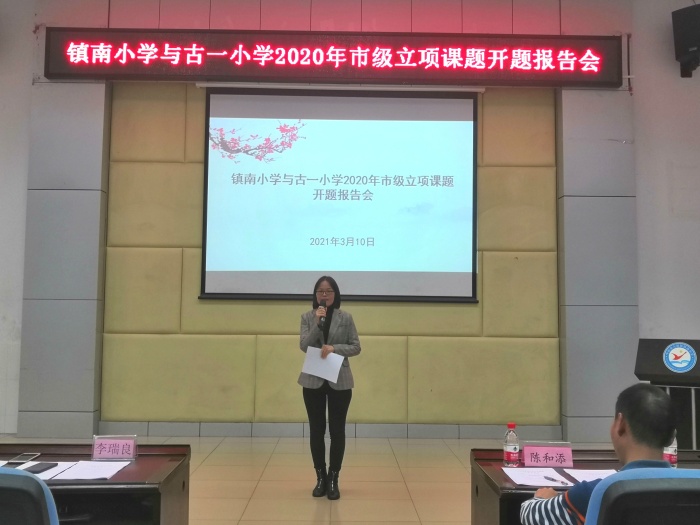 打印 |为进一步明确课题的研究思路,完善课题实施方案,明晰课题研究思路,再次论证研究课题,3月10日下午,镇南小学与古一小学2020年市级立项课题开题报告会在镇南小学报告厅举行,三项市级立项课题《小学低年级数学绘本教学的行动研究》、《小学语文识字教学中渗透汉字文化的实践研究》、《学科整合视域下小学优秀传统文化主题式课程开发与实践研究》进行了开题工作。古镇镇教育与体育事务中心陈和添老师、李瑞良老师、古镇小学马焰副校长莅临指导。报告会由镇南小学廖秋菊副校长主持,两所学校市级立项课题组全体成员、学校各科组长、各学科负责人、骨干教师及树人坊成员参加了会议。
