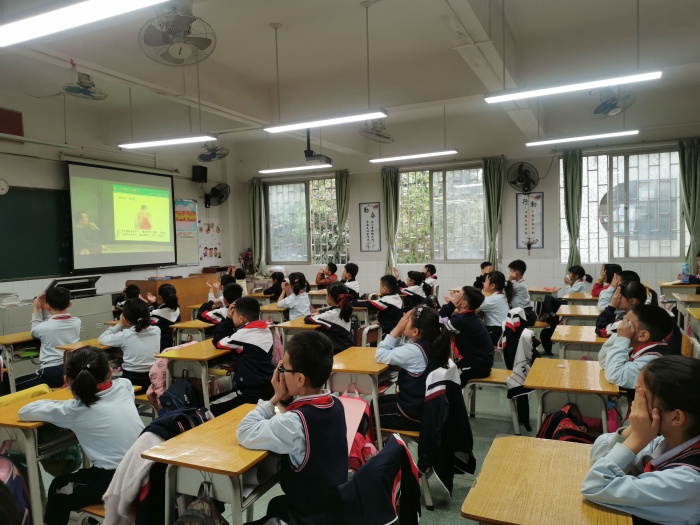 首先,来自古镇镇社区卫生服务中心的李医生向全体师生介绍了导致近视的主要原因,如长时间地看书、看点书,玩各种电子产品,户外运动较少等。李医生强调,小学时期是视力成长的重要阶段,若是用眼过度,很容易造成近视。接着,为了帮助学生减轻眼睛负担,李医生向同学们介绍了预防近视的具体可操作的方法,比如:保持正确的读书写字姿态、不长时间玩电子产品、利用下课时间眺望远方、每天要坚持做眼保健操,多参加体育运动,保持活力等。
