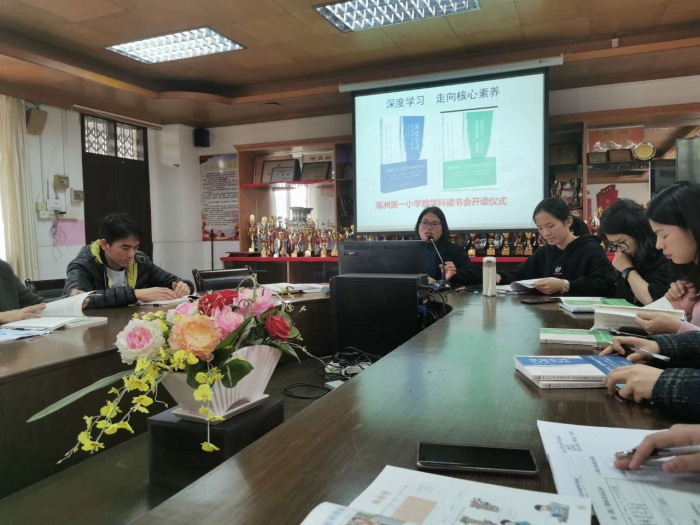 随后,在科组长的组织下,科组老师进行了《深度学习:向核心素养》一书的读书分享开读仪式。在仪式中,程木英老师带领科组教师开展了读书的价值探析与心得分享活动。活动中,程老师宣讲了读书会的书单,包括学科教学指南、理论普及读本等。程老师强调,要把课程改革作为落实立德树人根本任务的一个重要抓手和突破口,要求学科教师在深度学习教学改进项目研究与实验成果的阶段性总结时,能通过书籍得到进一步深化学习,提升自身素质。