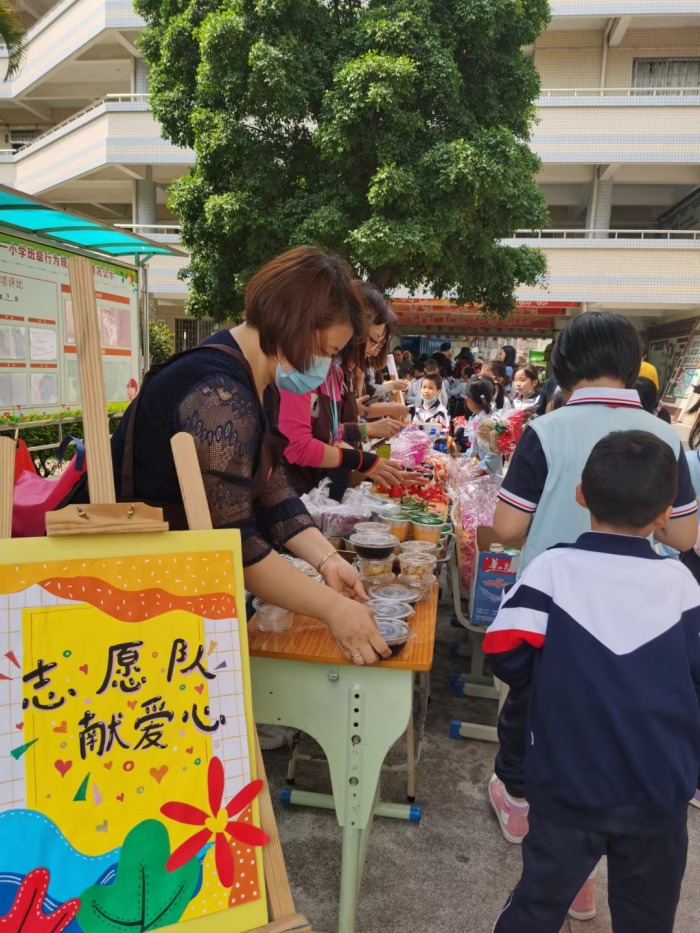 义卖活动开始前,每个班级的同学分工明确,各司其职,定制口号,制作展板和横幅;登记义卖物品、贴好价签;换好零钱、备好账本和钱袋,有条不紊地做着准备。同学们拿出自己心爱的玩具、图书、小摆设、手工作品和家长亲手制作的小吃等等进行爱心义卖活动,甚至有些班级还准备有抽奖活动、购买盲盒、福袋等营销方式,来增加了义卖的趣味性。学校的美术组、书法组和家长志愿者也摆出了特别准备的摊位来为义卖活动助兴。