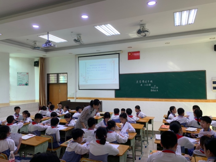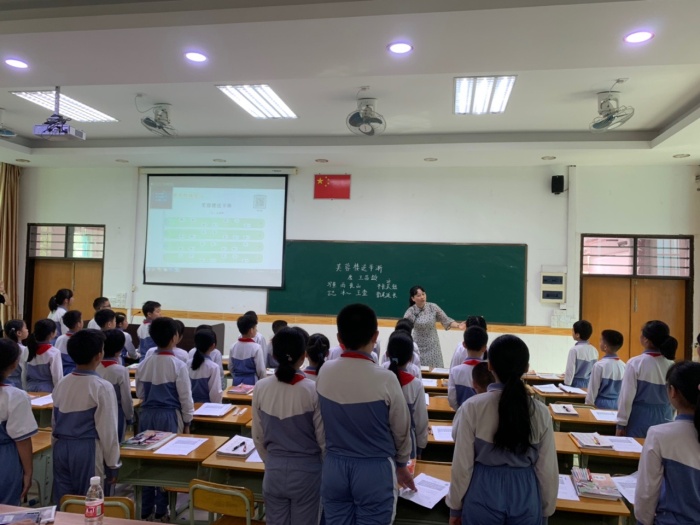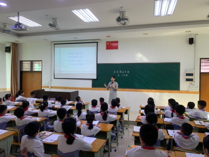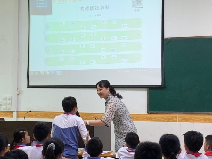 赵主任带来的课例为语文部编版教材四年级下册古诗《芙蓉楼送辛渐》,课堂上赵主任先以《出塞》一曲激发起同学们学习古诗的兴趣,并相机进行了诗题的解释及诗作者的介绍。为了让同学们更好地了解古诗和传达诗歌情感,赵主任引入了古诗吟诵的方法进行教学。为了让学生更好地学会吟诵,赵主任精心设计,以古诗“押韵”入手,先让学生了解平长仄短、韵尾延长的读诵方法,再加入手势,渐渐引导学生掌握吟诵。随后,赵主任带领同学们理解诗意、想象诗句描绘的画面,在想象中学习吟诵,在吟诵中体会诗人的情感。整堂课吟诵优美动听,以诵促情,且悟且诵,为在场的语文老师提供了古诗吟诵教学的新思路,新方法。
