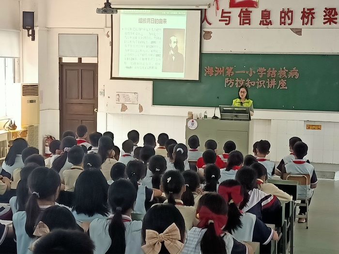 打印 |为贯彻落实《“健康广东2030”规划纲要》要求,让师生更好地了解肺结核防治知识,提高师生预防肺结核意识,深入开展结核病防治健康教育,2021年3月30日下午,海洲第一小学特邀请古镇镇社区卫生服务中心民乐社区卫生服务站李静医师来校作学校结核病防控知识讲座。