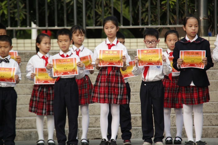 激动人心的颁奖仪式来了,学校的领导们分别为低年级科技节植物种植活动、中年级科技环保小制作、高年级植物调查报告以及四年级参观水厂观后感征文评比等活动进行颁奖,并与班级代表合影留念。