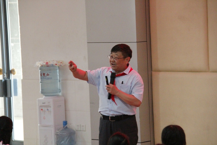 在宣讲活动伊始,学校学生代表为李建军博士佩戴红领巾,对李博士献上少先队员最崇高的敬意。李建军博士作为北京自然博物馆研究员,一直从事以恐龙为主的古脊椎动物学的科研、科普和展览等工作。他不仅在学术论著上成果丰厚,还主持过各种大型野外恐龙化石的发掘工作,实践经验丰富。李博士的到来,受到全体师生的热烈欢迎。