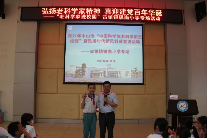 打印 |为了丰富校园第五届科技节活动,结合2021年中山市“中国科学院老科学家科普演讲团进校园”活动,3月30日,镇南小学举行“老科学家进校园”暨弘扬时代新风科普宣讲活动。此次活动特邀请中国科学院老科学家宣讲团成员李建军博士开展以《恐龙足迹讲述远古故事》为主题的宣讲活动。镇南小学校长杨红卫、副校长廖秋菊和六年级全体师生共享此次科学盛宴。