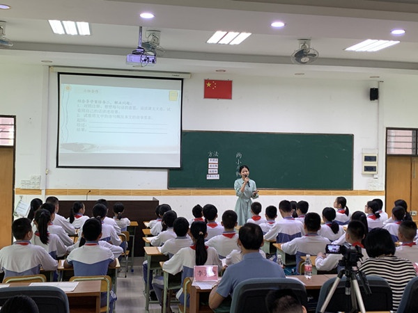紧接着评课指导环节。首先,黄老师上课后结合教材、结合学情和结合单元主题做了简单的反思,她表示课堂学生的小组合作是经过六年时间的培养,所以学生能够默契地在课堂上展示自己,但对于文言文的文体把握和中下生的关注还有待加强。接着,镇区兄弟学校的老师们围绕课堂小组合作的形式和课堂内容的教授进行了简单点评。然后,梁老师从“古镇特色小组合作、文言文文体教学、语文学科理念”等三个方面进行了细致而又深刻的讲解。梁老师认为黄老师的课堂是具有鲜明古镇特色的一堂课,小组合作和导学案的设计,体现“以生为本、以学为本、先学后教、因学定教”的特点;导学案与课堂推金融和,又体现“任务驱动、借助工具”的特点;同时在教授文言文的时候,教师通过“因义定音、意义断句”的文体技巧,努力呈现文言文的课堂。其次梁老师针对课堂也提出了“设定什么目标——运用什么方式方法——达到什么积累程度——上挂下联把握整个单元——拓充资源升华主题”等五个方面评课意见。最后她强调,语文教师一定要有清晰的课程观念,懂得如何运用教材,让学生在小学阶段的语文素养从量的积累到质的飞跃。