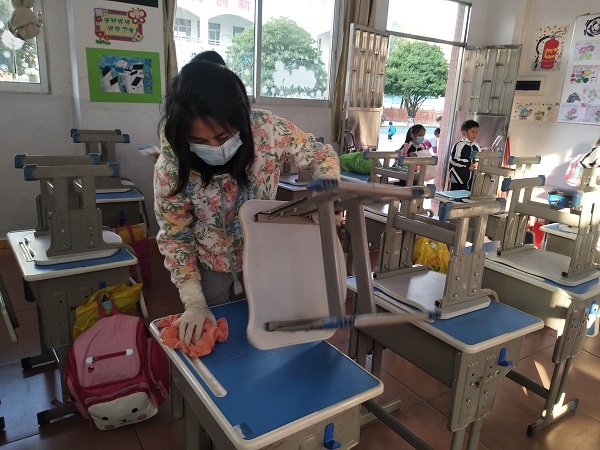 师生、家长齐动手,不惧脏、苦、累!大家擦窗、扫地、擦黑板、拖地、整理书柜,各司其职,一些比较隐蔽、平时容易被忽略的卫生死角,如吊顶风扇、天花板四角,也被师生、家长们细心清理,校园内都是一片热火朝天的劳动景象。通过大家的努力,校园也因此变得干净、整洁、美丽。